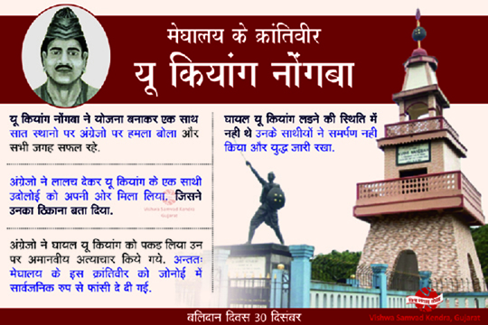 उन्होंने प्रस्ताव रखा कि यदि तुम्हारे सब सैनिक आत्मसमर्पण कर दें, तो हम तुम्हें छोड़ देंगे; पर वीर यू कियांग नोंगबा ने इसे स्वीकार नहीं किया। अंग्रेजों के अमानवीय अत्याचार भी उनका मस्तक झुका नहीं पाये। अन्ततः 30 दिसम्बर, 1862 को उन्होंने मेघालय के उस वनवासी वीर को सार्वजनिक रूप से जोनोई में ही फाँसी दे दी।